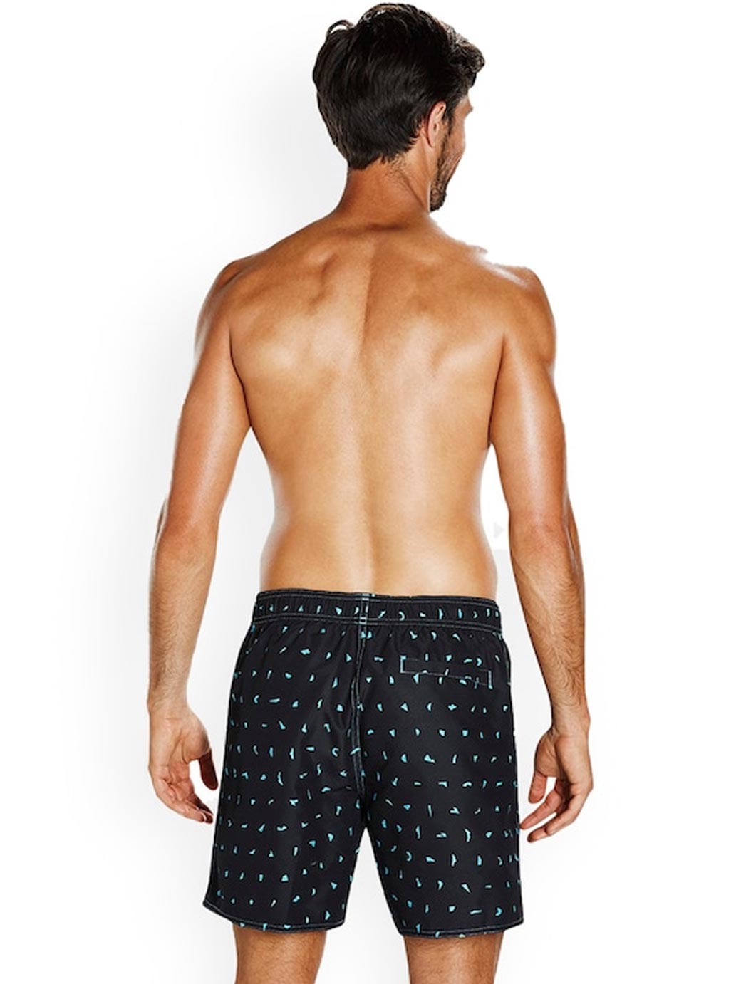 Black printed swim bottoms, has an elasticated waistband with drawstring closure