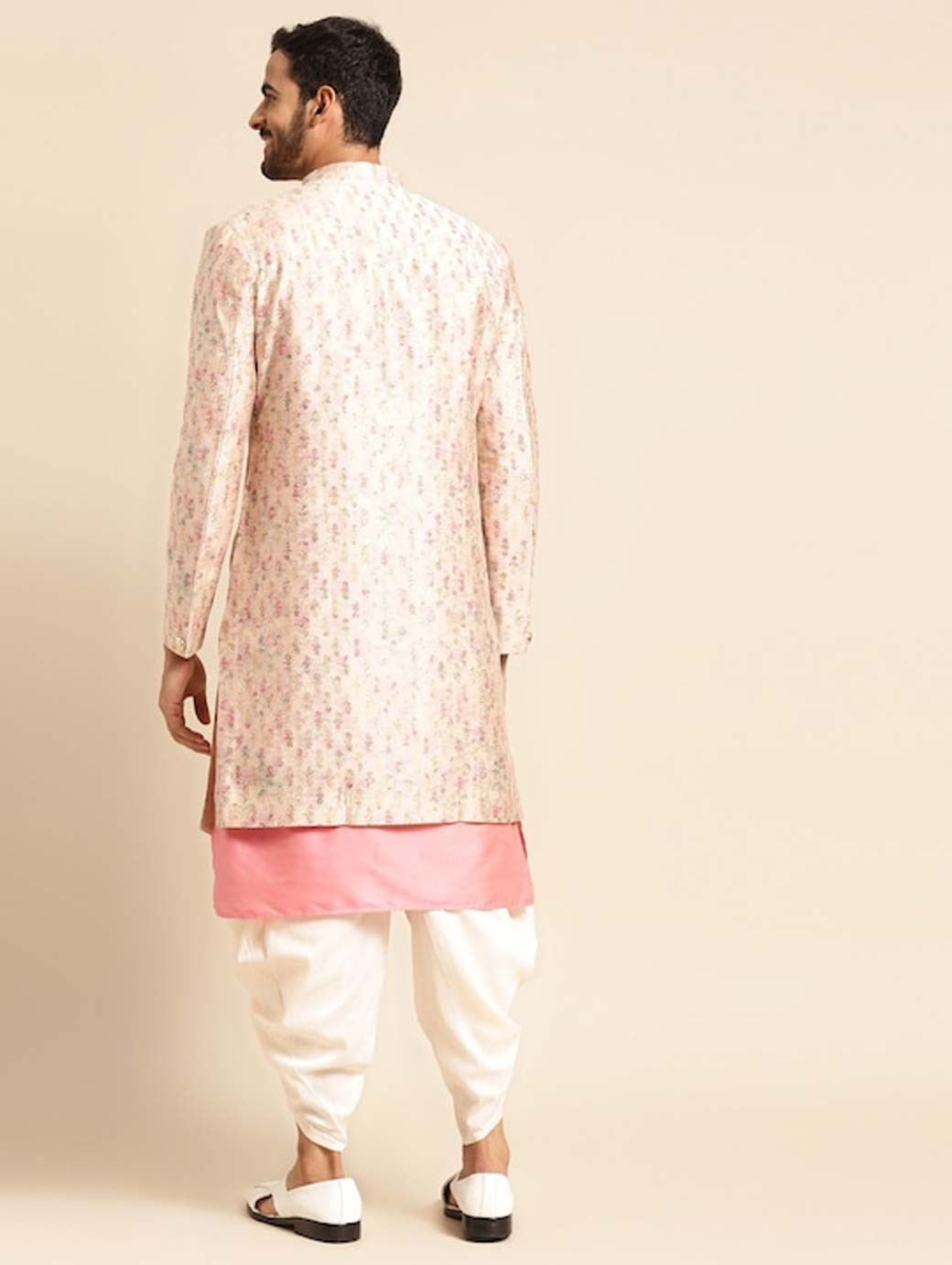 Men Cream-coloured & Pink Woven Design Sherwani Set