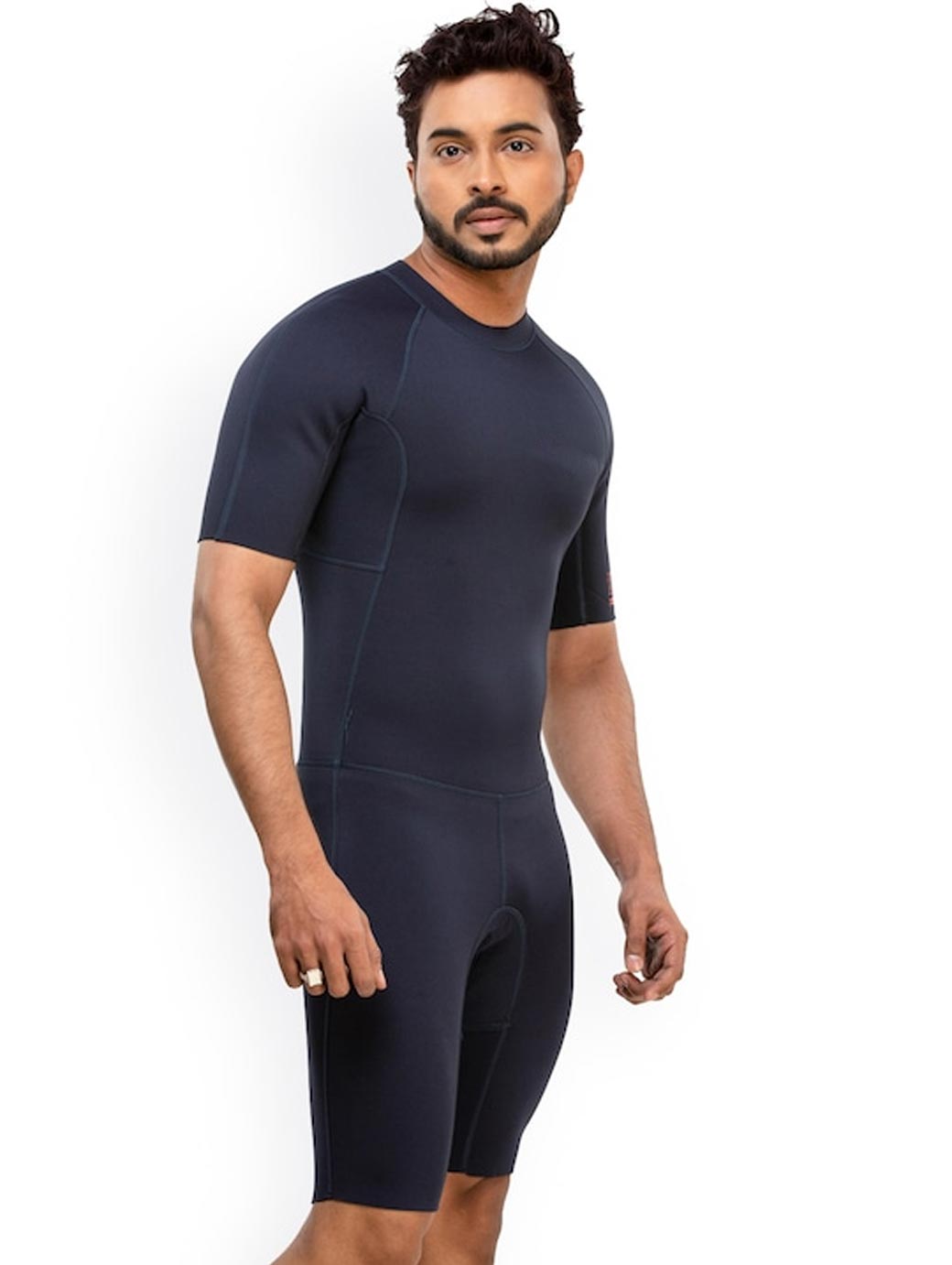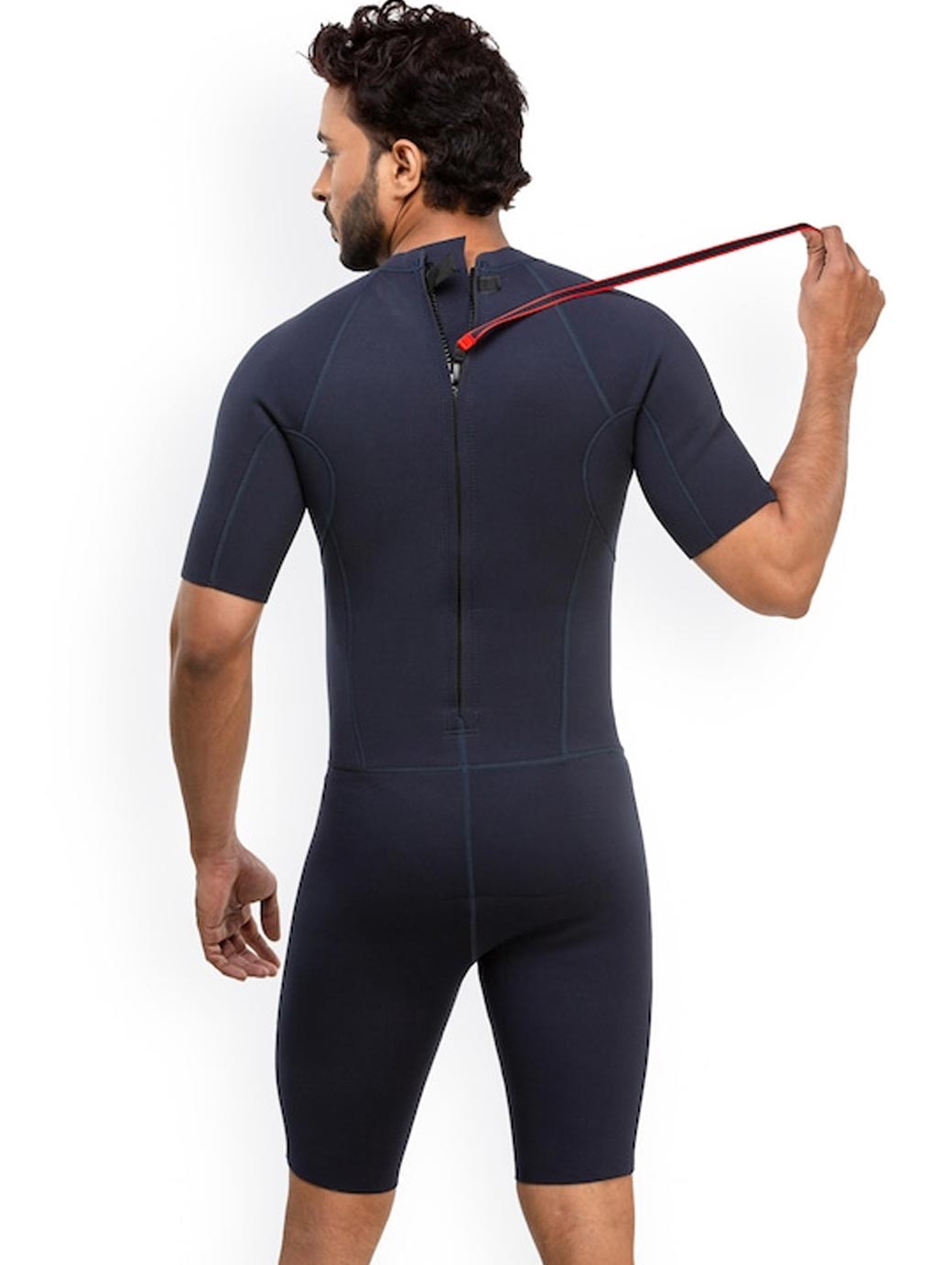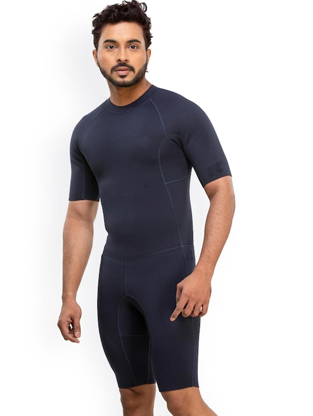 Navy blue solid shorty swimsuit, has a round neck, short sleeves, zip closure on the back