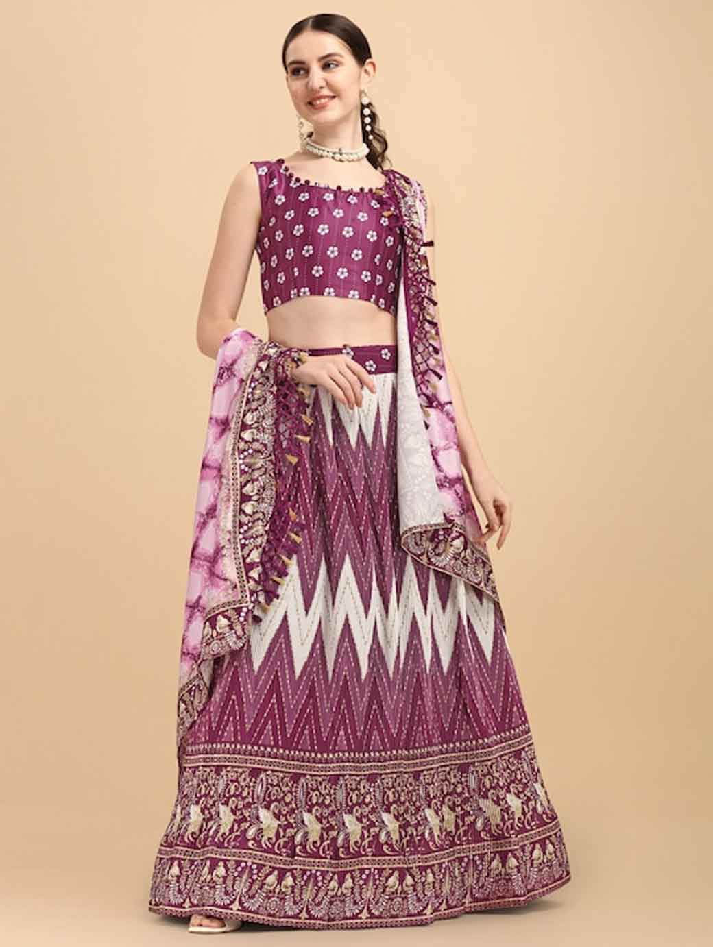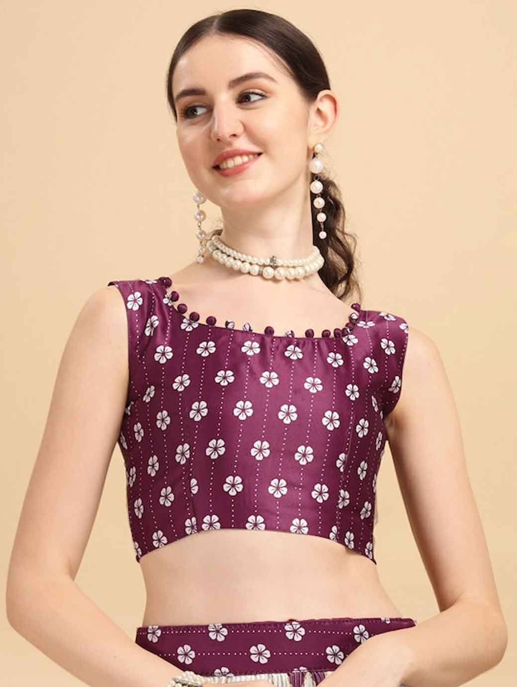 Purple and white printed unstitched blouse, has a round neck, sleeveless, purple and white printed semi-stitched lehenga, flared hem