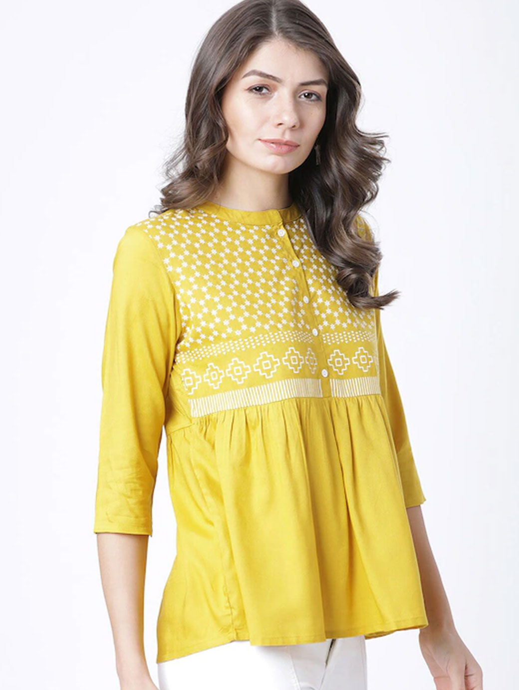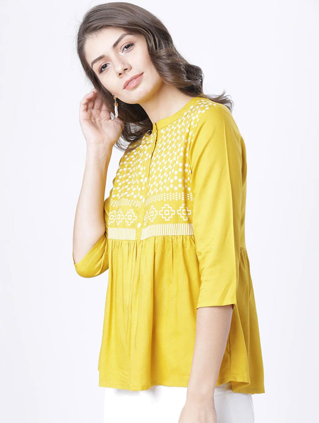 Mustard regular a-line Top printed woven round neck three-quarter sleeves , regular sleeves sleeves gathered or pleated 2021 hem button.