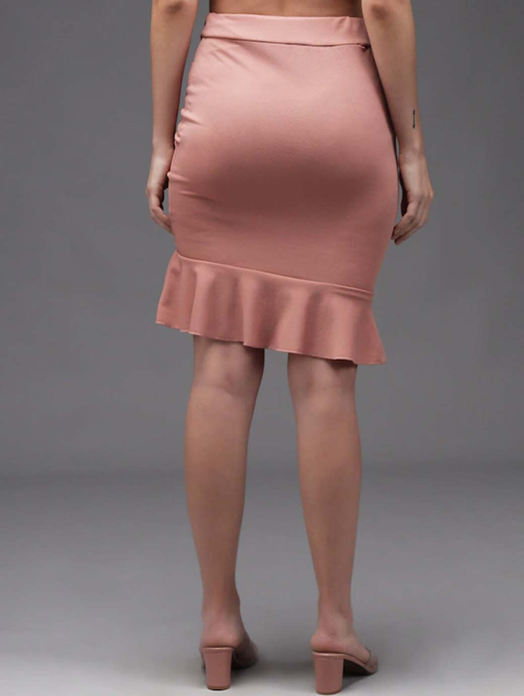 Mauvevsolid knee length pencil skirt with gathered detail, has an elasticated waistband with slip-on closure and straight hem
